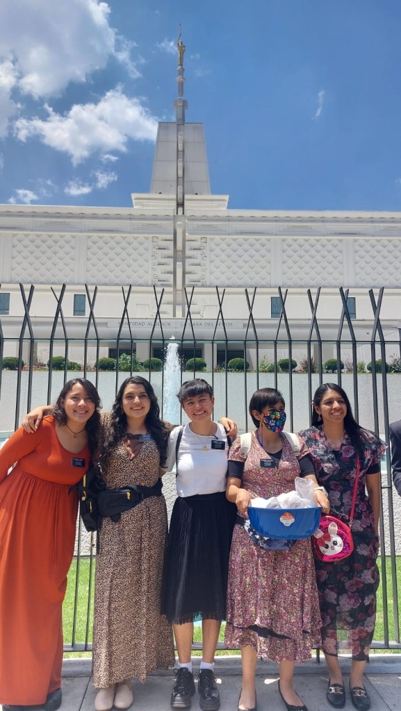 En el CCM ese día me atreví a comer en el comedor con la hermana Chuy y con el hermano Abraham por primera vez. Como tal vez ya he mencionado, me afecta mucho ver misioneros de enseñanza, pero ese día me sentí valiente. Me senté ahí, con ellos. Incluso vi unos misioneros de servicio. De repente sí sentí el gran deseo de salir corriendo pero me contuve y tuve una experiencia bonita. Logro desbloqueado. En esta otra foto, que fue el mismo día pero más tarde, estamos celebrando el cumpleaños del consejero del presidente del CCM y de un misionero de servicio que trabaja ahi, élder Aldaco, quien tiene autismo. Ahí conocí a la presidencia del CCM y a sus esposas y a otras personas que trabajan en ese lugar. El elder Castañeda comenzó haciéndome mi primera entrevista mensual y terminamos en una fiesta de cumpleaños. Lleve un buen de pastel a mis papás esa noche. Voy a ser totalmente honesta aquí, aquel jueves en el templo fue un día muy difícil para mí. Había pasado la noche anterior preparando mi clase de instituto y había dormido muy poco porque tengo que estar en el templo a las 6:30 am. Como obrera siento que estoy muy pero muy lejos de saber cómo se hacen las cosas. Solo he estado en las ordenanzas una sola vez y tener que coordinarlas sin acordarme de cómo es la experiencia de participante es muy difícil para mí. Ese día cometí varios errores. Y me sentí tan mal que me puse a llorar y decidí irme a mi casa dos horas antes de que terminara mi turno. No quiero fallarle a Dios pero siento que también está bien ser compasiva conmigo misma. Espero que pueda sentirme mejor porque realmente quiero tener una buena relación con el templo pero me siento tan ignorante…