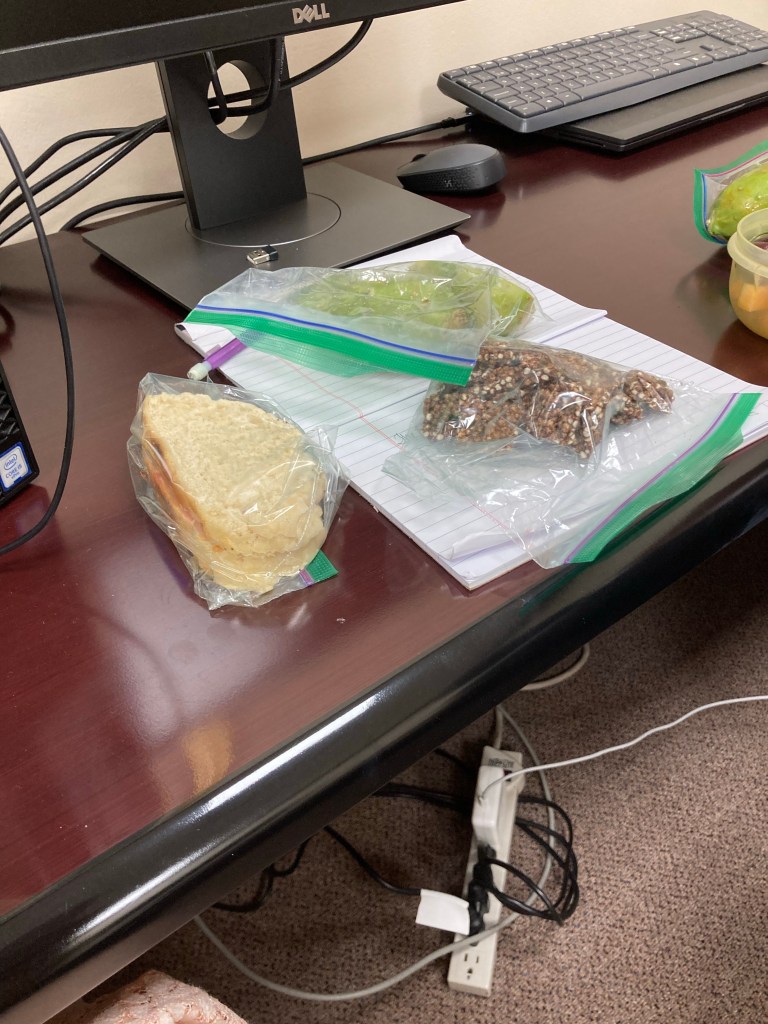 La hermana me sigue conmoviendo con sus sandwiches, pues ahora ella hizo el pan y también la mermelada, ademas me llevo barritas veganas de quinoa con chocolate y tunas. Me siento muy amada por ella.