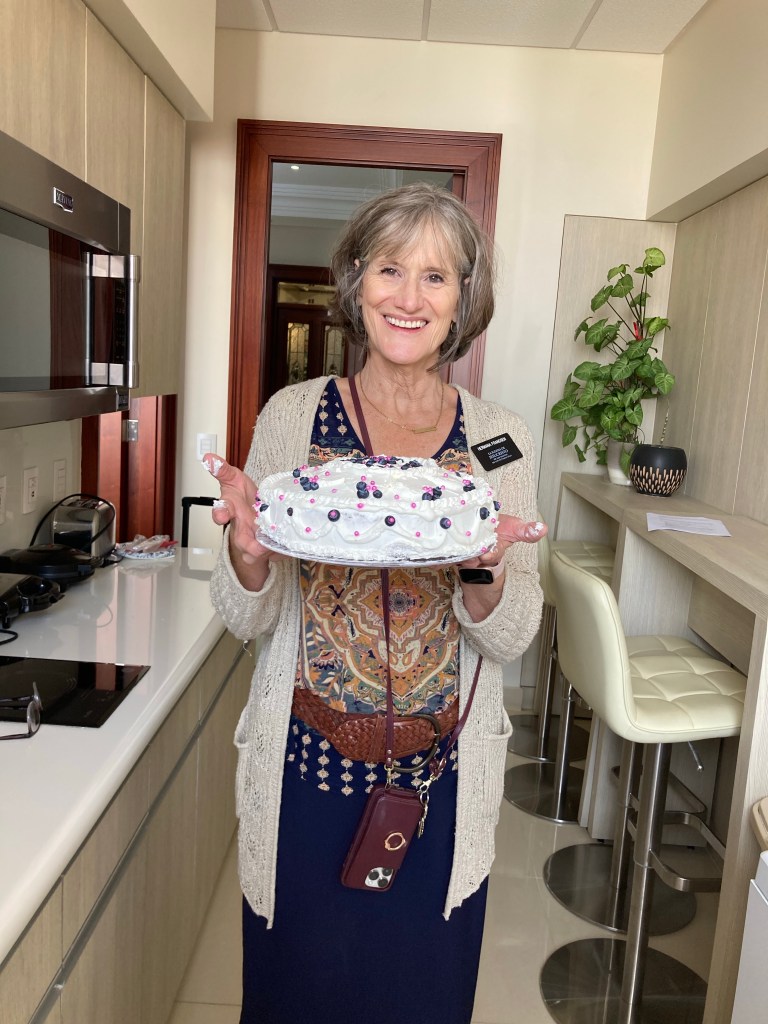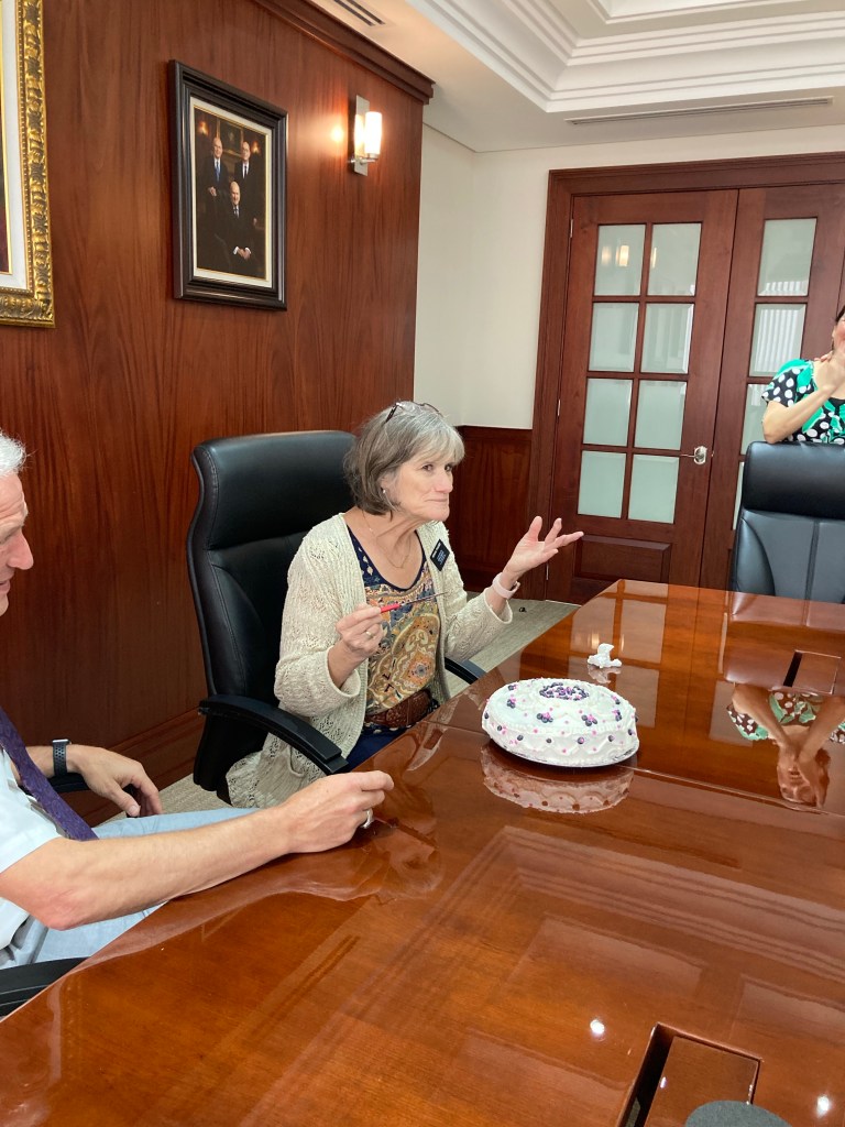 Tuvimos que ir a la oficina de la presidencia de Area para tomar un video sobre normas de vestir y de apariencia con la hermana Argueta, una hermana del matrimonio de secretarios de la presidencia. Como la hermana Frandsen quería compartir su pastel, les llevamos pastel a todos los de esa oficina y nos invitaron a partirlo en la sala de conferencias. También le llamamos al élder Frandsen para que viniera con nosotros. Antes de partirlo cantamos «Las mañanitas» y «Happy birthday» para ella.