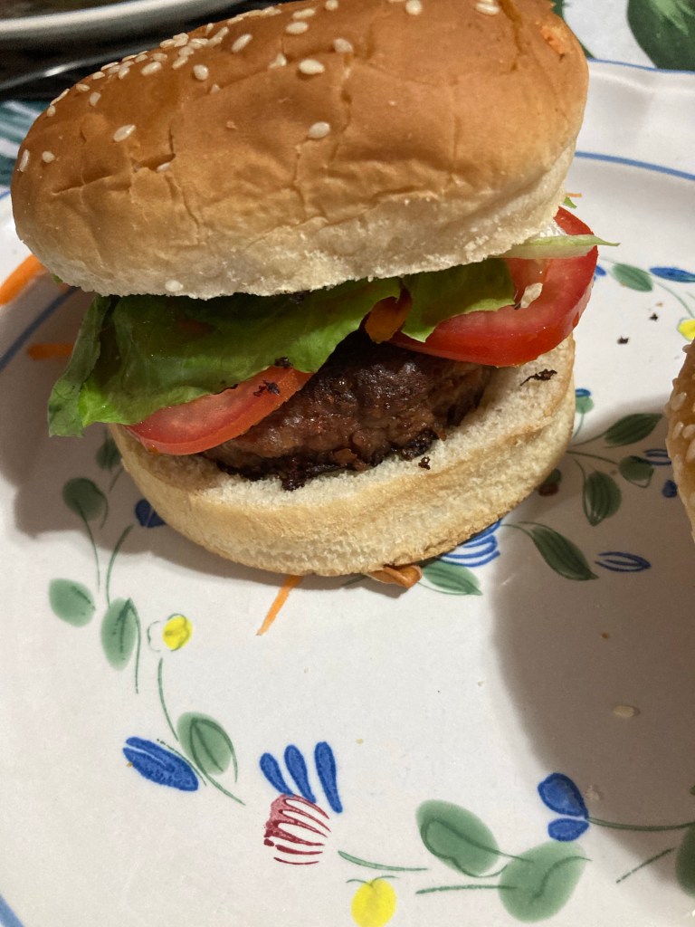 La comida fueron hamburguesas hechas en casa. Mi super papá me compró las Beyond Burger y me sentí muy feliz porque nunca las había probado y me encantaron