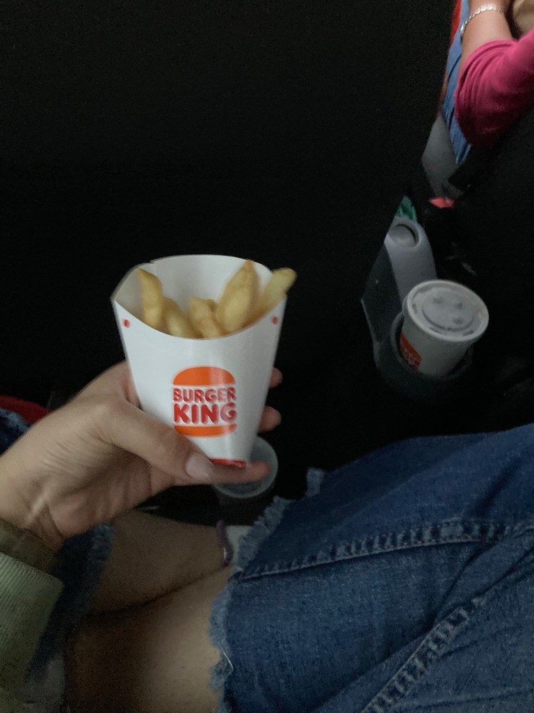 Estábamos mojados, cansadísimos y hambrientos cuando nos subimos al auto, compramos unas hamburguesas y nos fuimos a la casa a ponernos la pijama, comer nuestras hamburguesas y dormirnos porque estábamos muy cansados.
