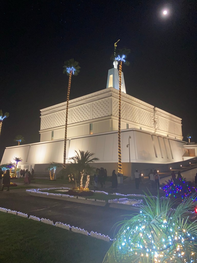 Las luces en los jardines del templo se veían muy bonitas. Mi prima Casy junto con su familia, mi tía Sandy, tío Carlos y Charly , quienes fueron invitados al programa me dieron un ride hasta mi capilla en donde se estaba llevando a cabo el servicio funerario de la hermana Michaux.