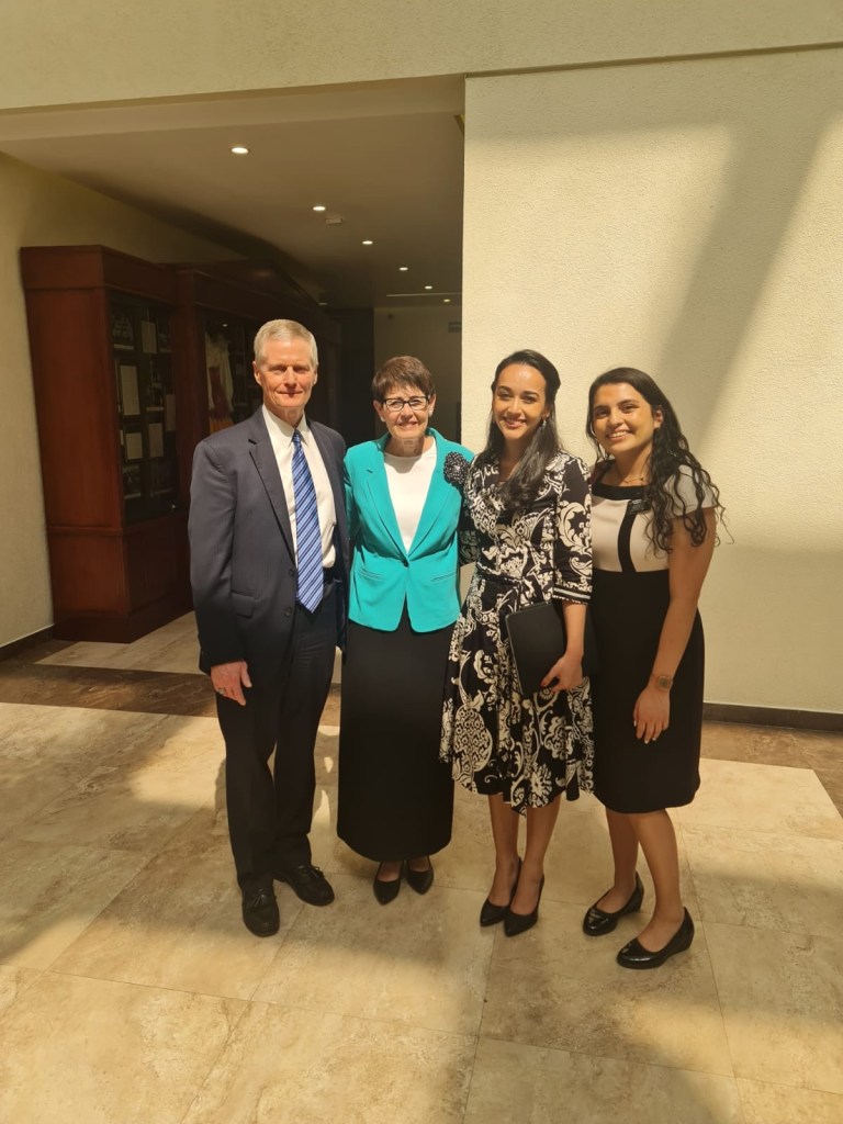 Algo super especial también es que mi tío Abel Ruiz fue el intérprete del élder Bednar en todo momento. Cuando terminó la reunión con los embajadores, en donde un Coro especial de misioneros se presentó y el élder Bednar compartió un mensaje, acompañé a la hermana Michelle a la sala privada para preparar algunos obsequios y en ese momento nos encontramos con mi tío Abel, el élder Bednar y su esposa. Yo me acerqué con mucho respeto al apóstol y le entregué una nota de agradecimiento (con muchos stickers) que le había hecho. La hermana Bednar dijo «You wrote a note for me too». En ese momento el tío Abel dijo que podía tomarnos una foto, yo pensé que era para Michelle con ellos, pero la hermana Michelle me dijo «Véngase a la foto, hermana Lima». Me siento muy feliz de poder tener esta foto.
