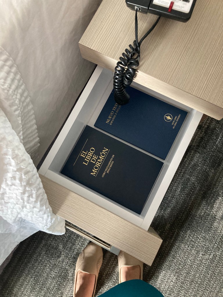 Llegué al hotel, llamé a mis papás, platiqué con mis amigos y escribí en mi diario antes de dormir. Al día siguiente al despertar me encontré que en el cajón había un Libro de Mormón y yo estaba muys orprendida. pensé que tal vez tendría algo que ver con la viita del élder Bednar porque nos estabamos hospedando en el mismo hotel que él. Sin embargo cuando bajé a desayunar, la hermana Berret me explicó que en todos los hotelers Marriott hay Libros de Mormón en los cajones porque el dueño original de la empresa es miembro de la Iglesia. El desayuno estuvo increíble, había opciones de comida protéica vegana.