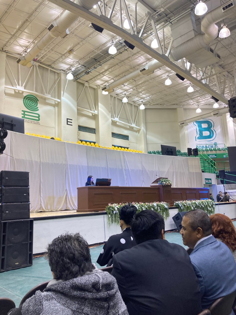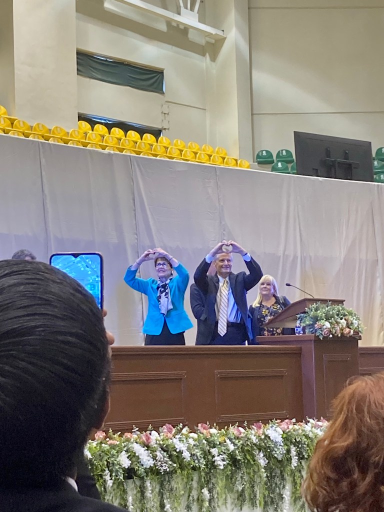 El domingo por la mañana fuimos a un gimnasio del Colegio de Bachilleres de Ciudad Juarez en donde se llevó a cabo una conferencia multiestacas con casi cuatro mil personas. La conferencia fue algo muy hermoso en dónde el élder Bednar invitó a los miembros a mirar a él en todo pensamiento.