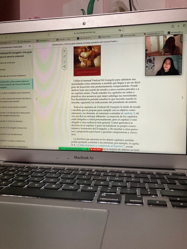Esta semana me sentí muy bien en la misión. Fui a las oficinas de comunicación el lunes y el martes. Comencé a estudiar Predicad Mi Evangelio con mi compañera la hermana Franco y me hace muy feliz aprender de ella, quien estuvo en la misión de enseñanza. Con la hermana Cirilo, mi otra compañera, puesto que estamos en trío aún no hemos podido estudiar porque ella no tiene WiFi o señal en el lugar en el que vive.