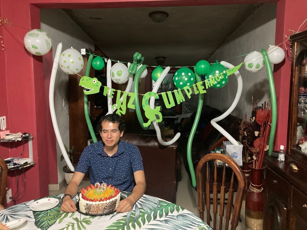Fuimos a comer hamburguesas por el cumpleaños de mi hermano Lalo, también compramos un pastel y decoramos la casa con globos de dinosaurio. Estaba Charly, la novia de mi hermano y Jan, su mejor amigo.
