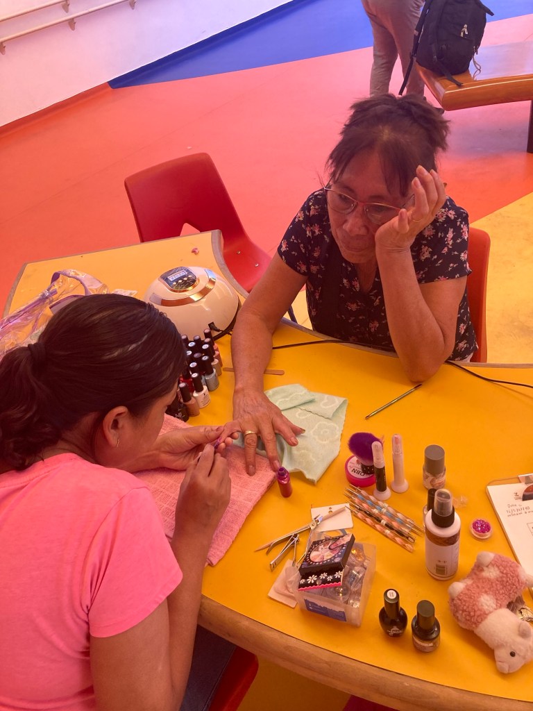 El viernes por la mañana di mi última clase de instituto a mi alumna Xime, que fue una reunión de testimonios y le agradecí por ser una excelente alumna. Le dije que sería una gran misionera. Después me quedé de ver con mi amiga Alma, que se acaba de bautizar este domingo pasado, para ir a dar el taller de uñas de gelish en el Teletón. Alma tiene insuficiencia renal y se cansa mucho, sentí que la hice caminar mucho para tomar el camión y me sentí culpable, pero en el taller todo salió super bien, teníamos muchísima gente. Alma llevó su material para compartir. Las jefas Jannett y Cyn le dijeron que podía venir cuando ella quisiera.