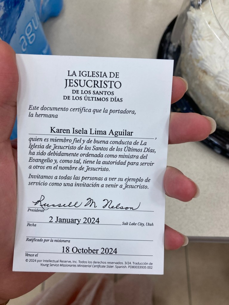 El jueves era un día que esperaba con ansias porque ya volvió a abrir el templo y entonces ya pude ir como obrera. Pensé que me cambiarían de lugar pero me volvieron a poner en la «Sala para Novias» pero ahora soy directora de mesa. Tuvimos a tres hermanas que vinieron al templo por primera vez. Me encantó. Algo que se siente super bonito es que trabajo de cerca con la hermana Fernandez, la esposa del presidente del templo, porque ella tiene una instrucción privada con las hermanas que entran por primera vez ahí en la sala de novias y ella confía mucho en mí.