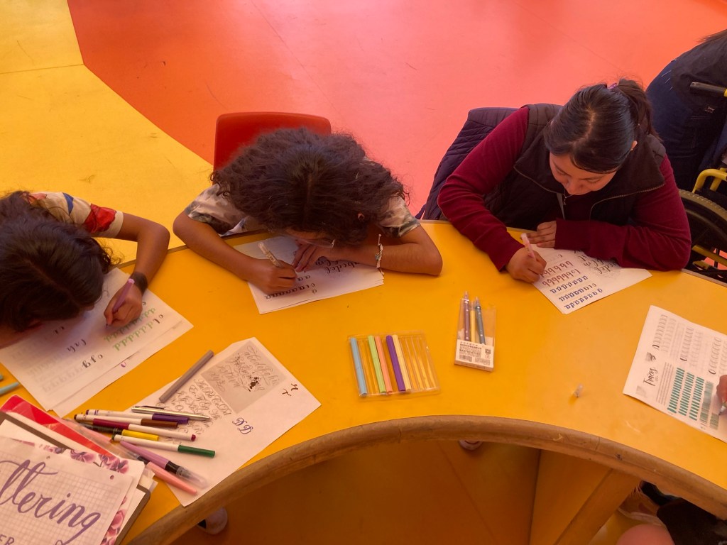 El miércoles fui al CRIT Teletón a dar el curso de Lettering, suelo dárselo a los adultos mientras que esperan a que sus hijos, nietos o sobrinos, salgan de sus terapias, pero como los niños ya salieron de vacaciones, muchos de los hermanitos de los pacientes están viniendo y se quedan en la sala de espera. Entonces, tuve muchos alumnos niños y al principio pensé que el lettering tal vez sería una técnica complicada para ellos, pero me sorprendí, en especial con Maité, una niña de cinco años que es paciente teletón y que sabe escribir su nombre completo en cursivas. Tuve tantos alumnos que se me terminó el material (las hojas de práctica) entonces a última hora solo me puse a dibujar con los niños en hojas recicladas. Por la tarde del miércoles fui a mi terapia.