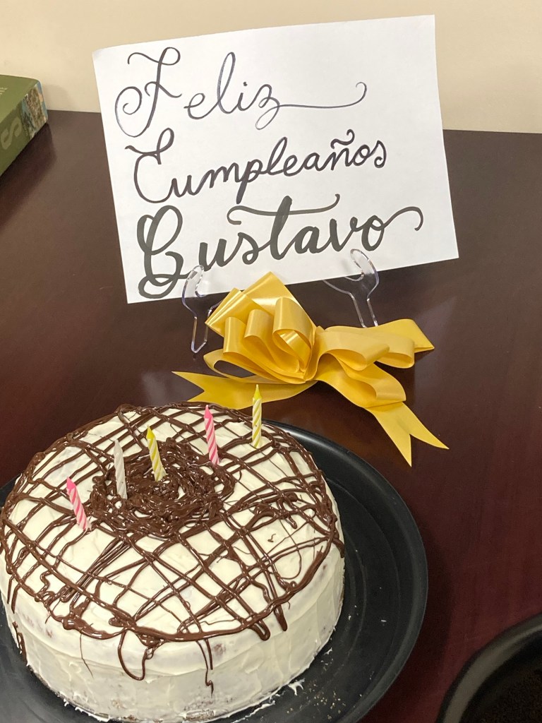 El martes volví a ir a la oficina y estuve con la hermana Sandoval. Tuvimos nuestra reunión de comunicación y partimos el pastel de cumpleaños del hermano Gustavo. Por la noche me mojé muchísimo porque estuvo lloviendo bastante.